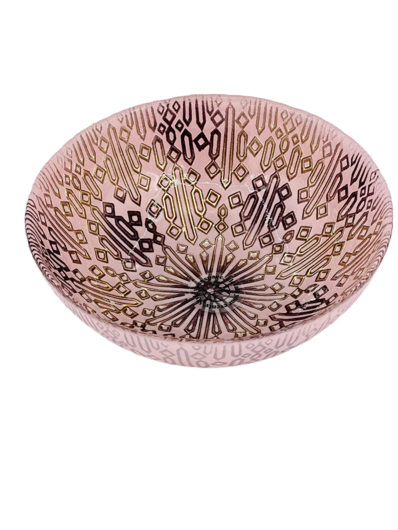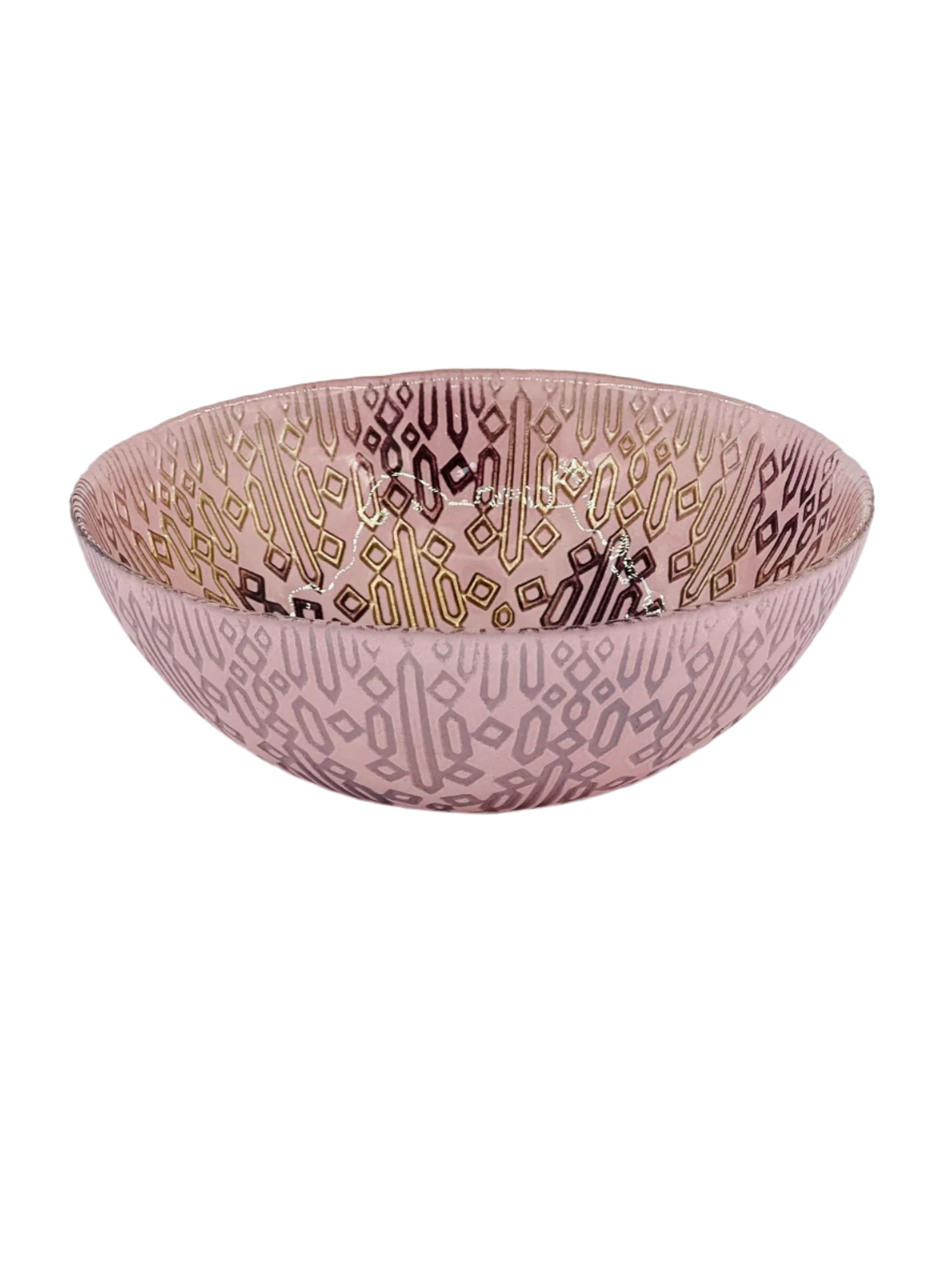 A modern, stylish soup bowl in soft rose pink. Features an all-over gold and burgundy geometric tile pattern with a frosted finish. Excellent for serving soup or as a decorative accent piece.