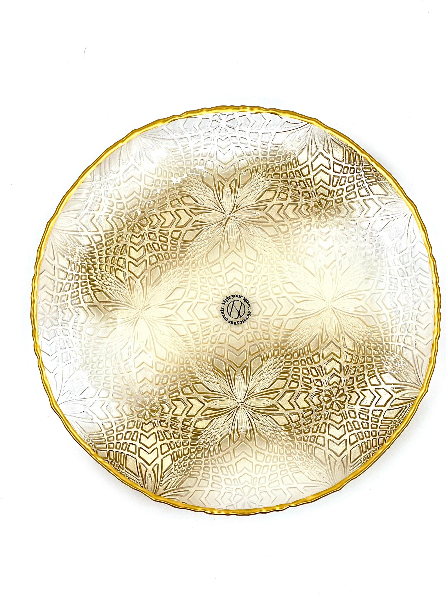 A highly detailed round platter with a mesmerizing geometric, tiled pattern accented with stylized snow crystals or floral designs. Finished with a bold gold rim, this piece is perfect for luxury serving or display.